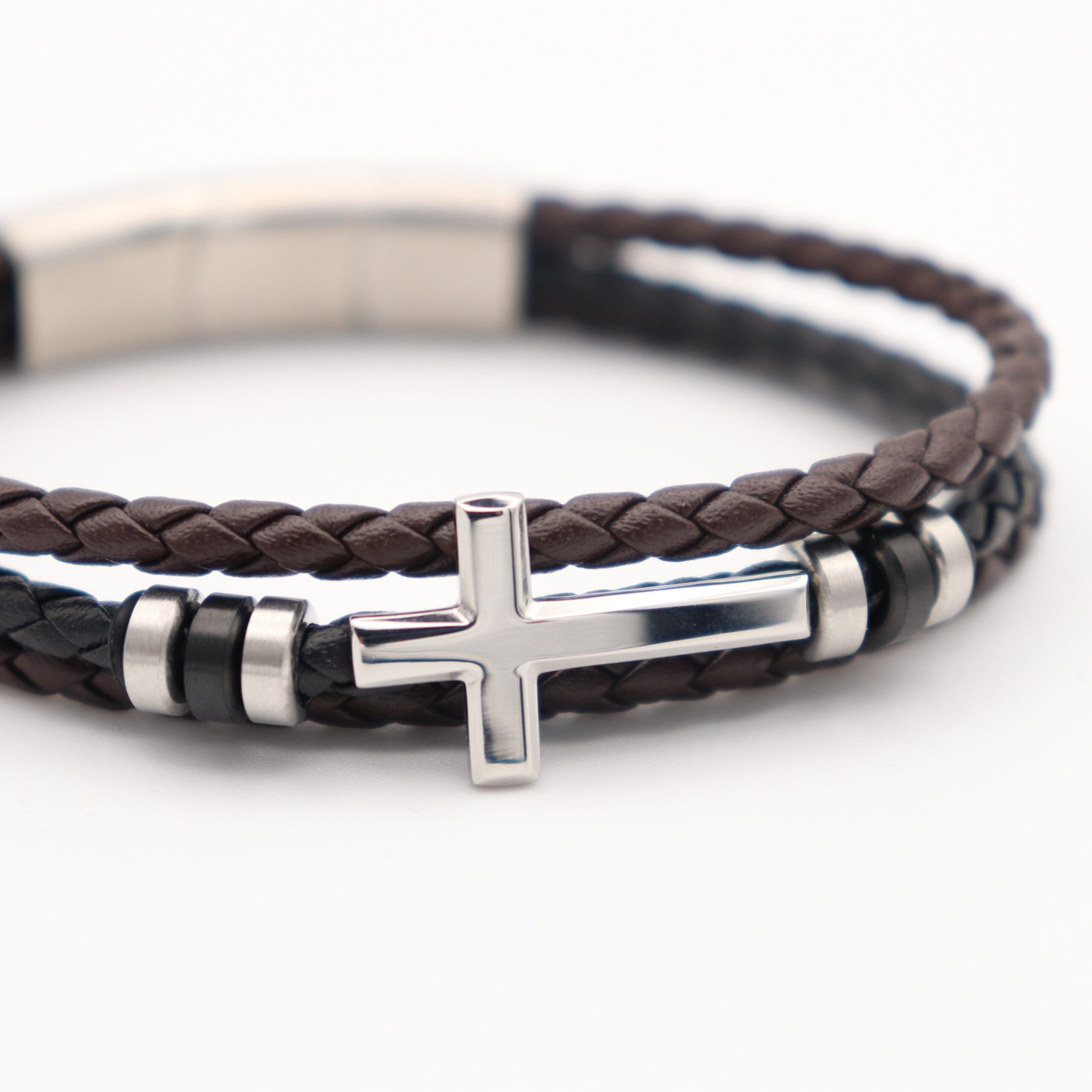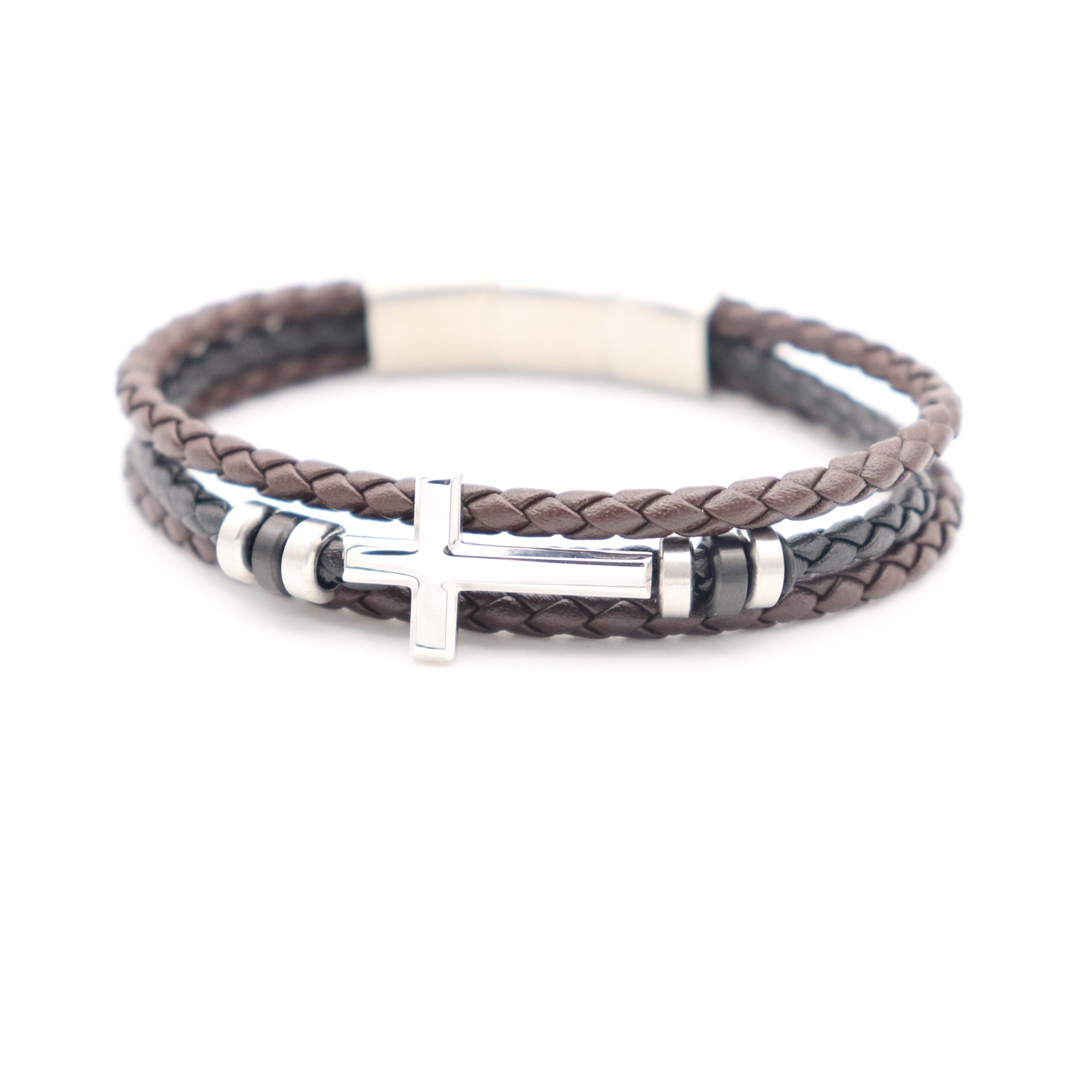 Dieses markante Armband aus Edelstahl und geflochtenem Leder überzeugt mit seiner dreireihigen Verarbeitung in Schwarz und Braun. Der matte Edelstahl trifft auf ein glänzend poliertes Kreuz – ein starkes Symbol für Glaube, Stärke und Verbundenheit.