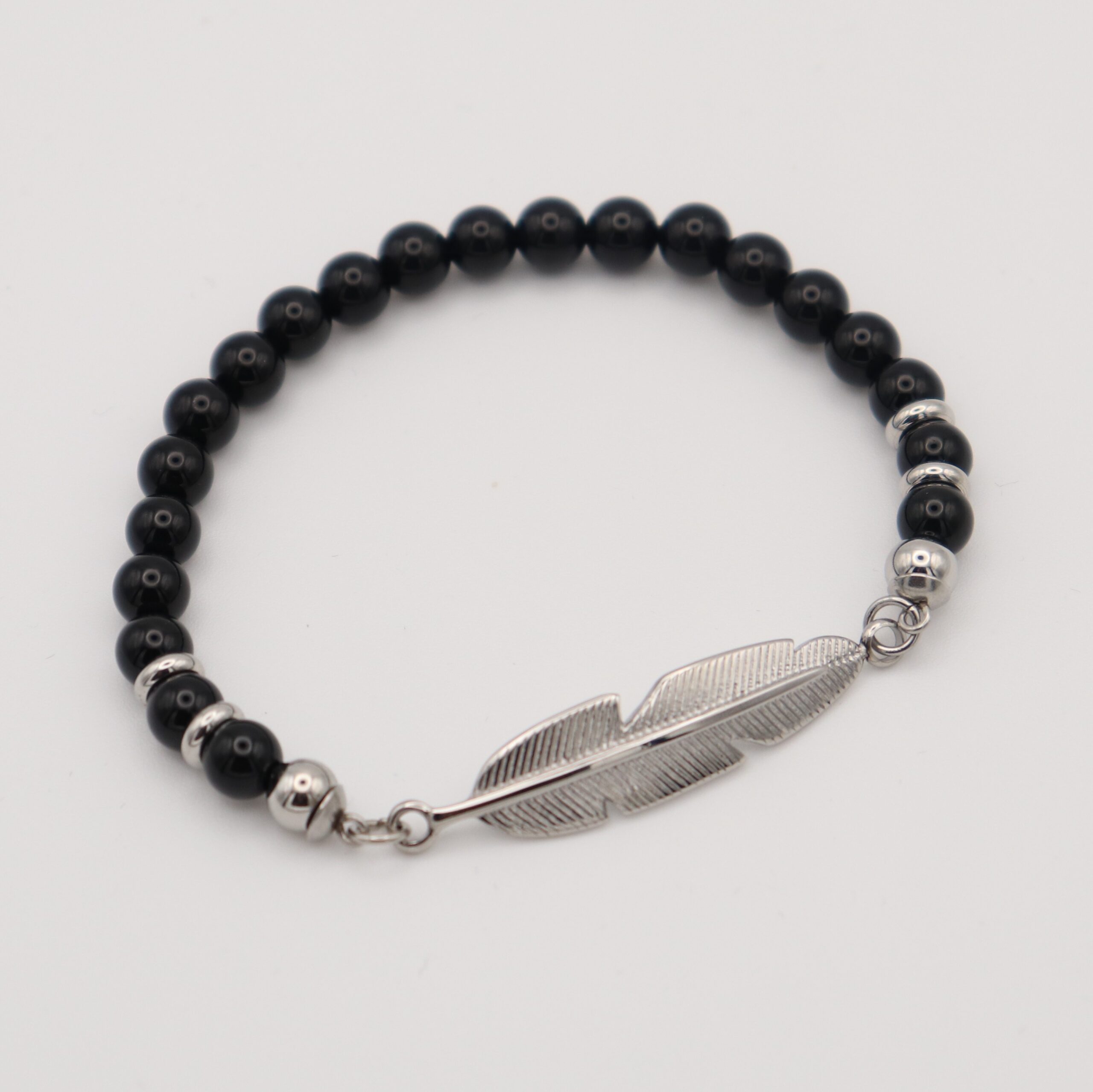 Dieses Armband vereint die Leichtigkeit einer filigranen Edelstahl-Feder mit der kraftvollen Eleganz schwarzer Kugeln. Die Feder steht für Freiheit und Leichtigkeit, während die schwarzen Elemente dem Design Tiefe verleihen und einen stilvollen Kontrast setzen.