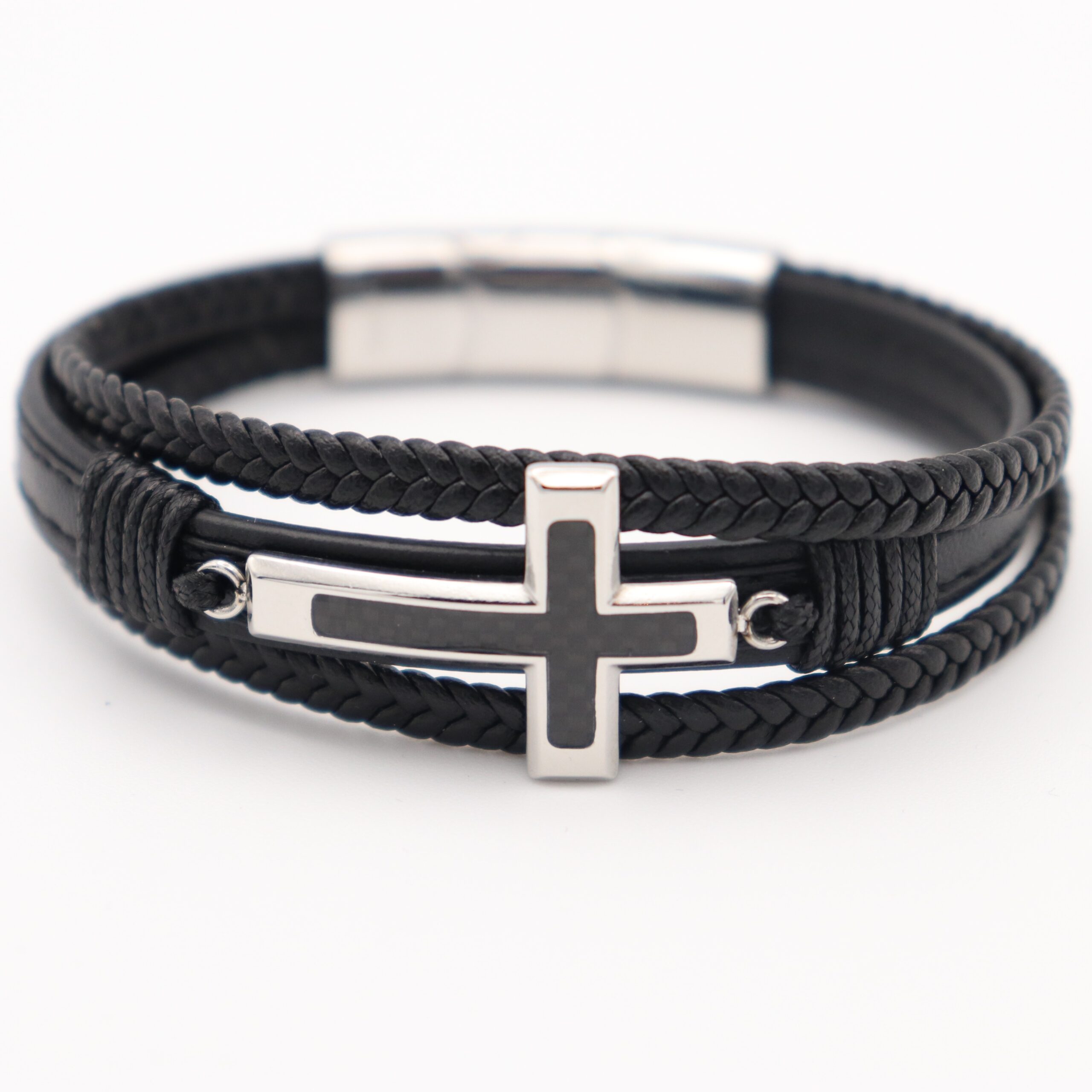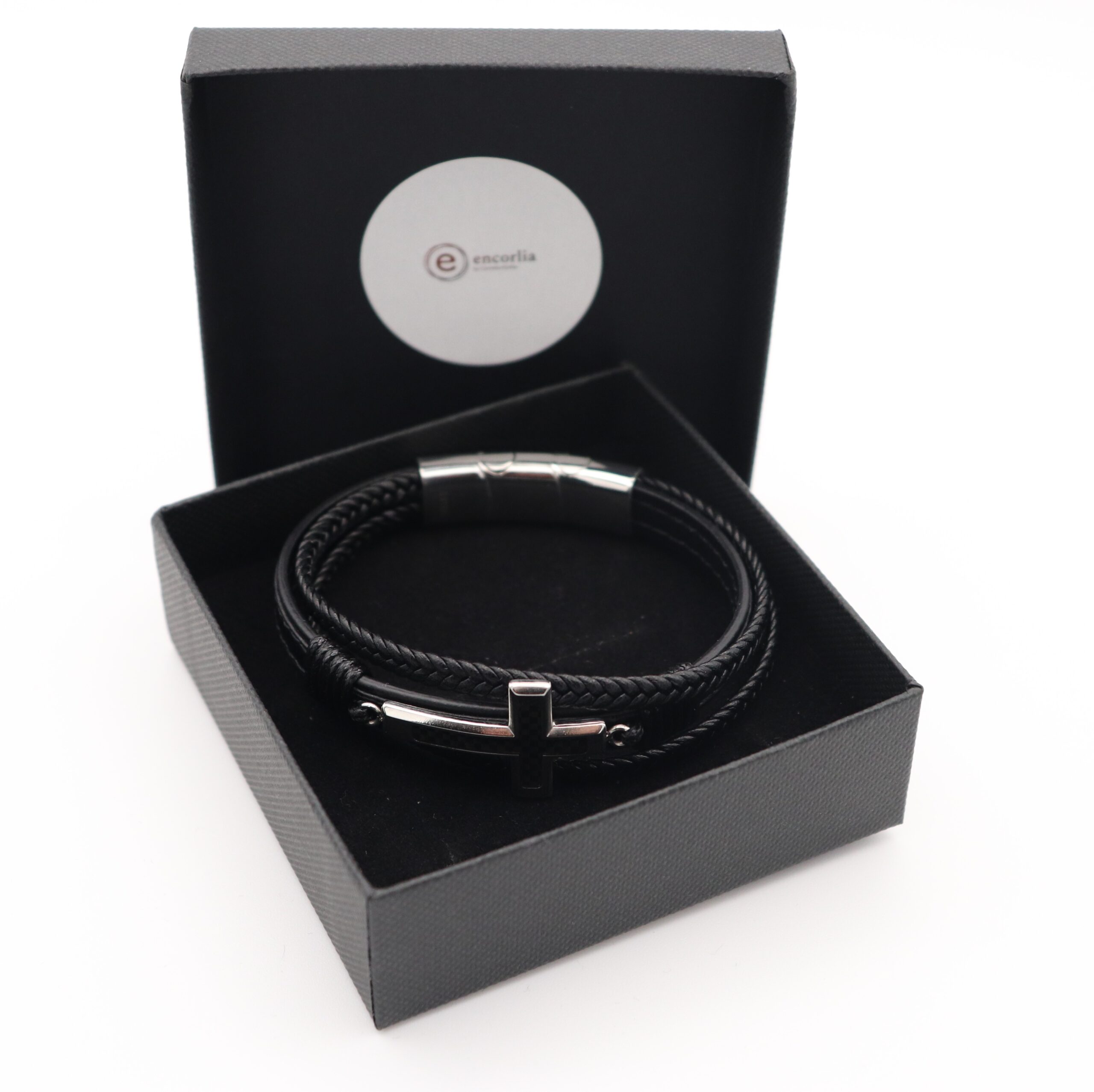Dieses Armband kombiniert mattes Edelstahl mit einem geflochtenen, schwarzen Lederband in 3-reihiger Ausführung. Das Highlight bildet ein poliertes Kreuz, das für Stärke, Glauben und Verbundenheit steht.