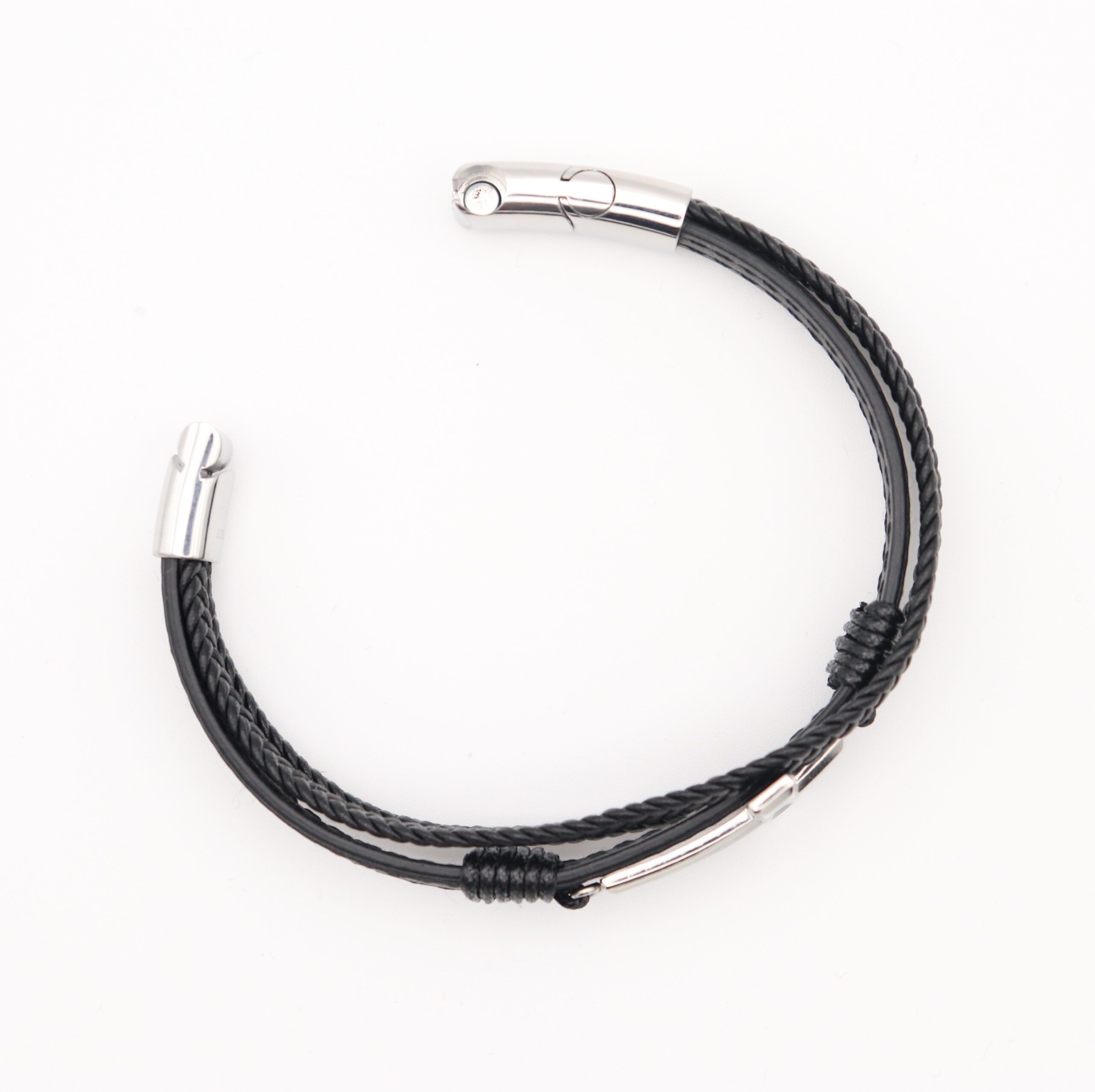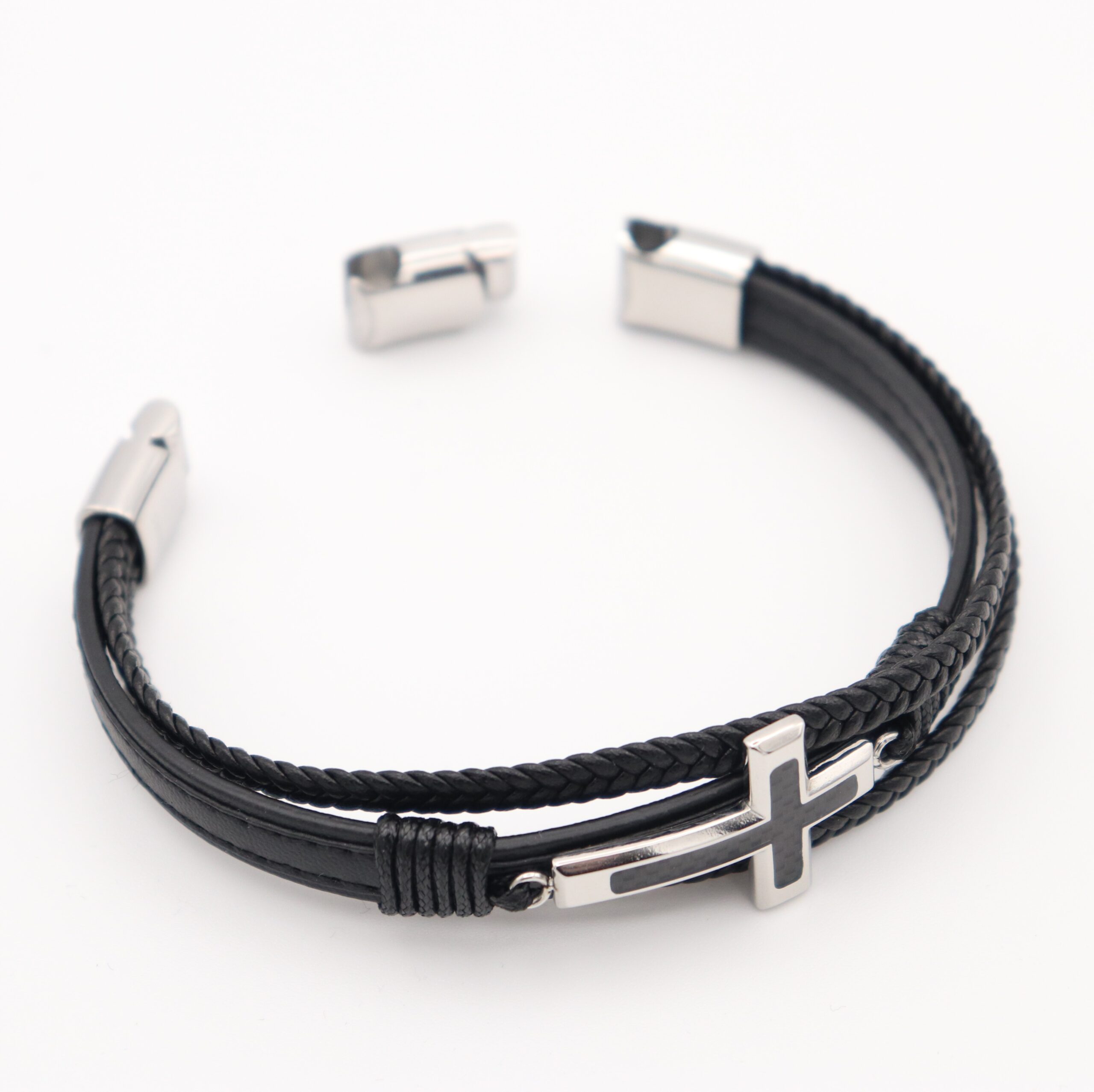 Edelstahl-Armband mit schwarzem Leder & Kreuz – 3-reihig