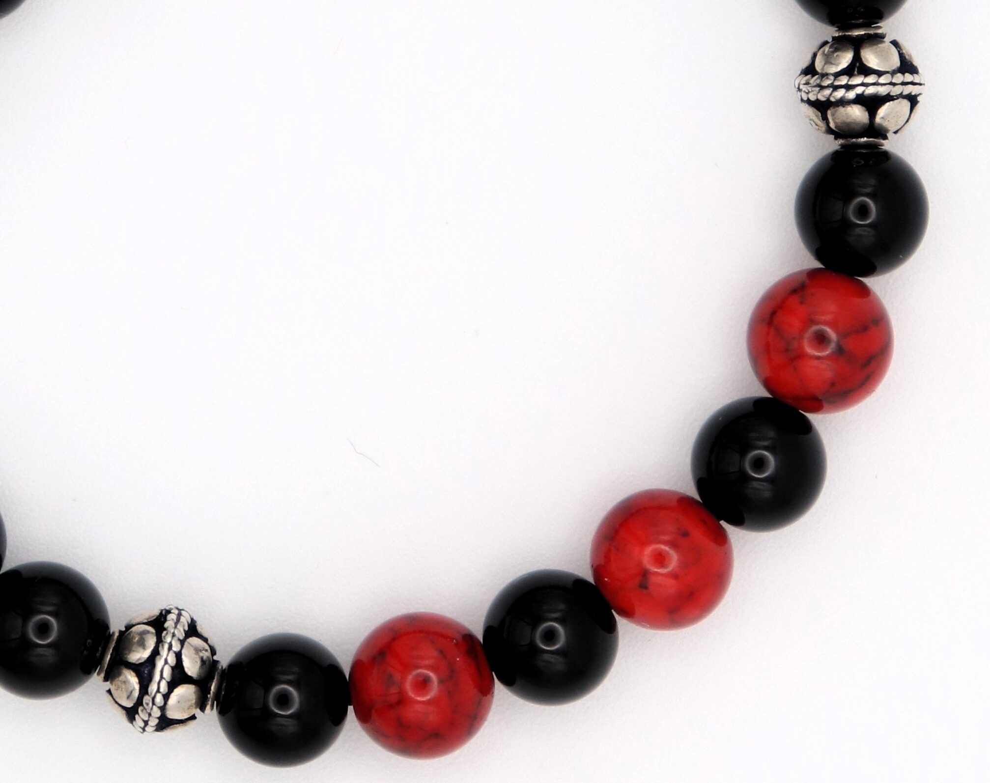 Dieses handgefertigte Armband kombiniert edle Materialien mit symbolischer Tiefe und modernem Design. Es besteht aus 8 mm großen Natursteinen: tiefschwarzem Onyx und intensivem Ruby Red Calcit mit einzigartiger Marmoroptik. Zwei kunstvoll gravierte Runenperlen aus 925er Silber (8 mm) sowie zwei schlichte Silberperlen (5 mm) verleihen dem Armband eine besondere, ausdrucksstarke Note.