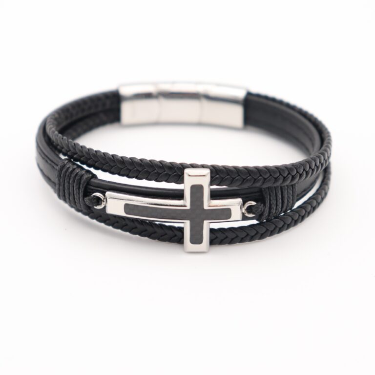 Edelstahl-Armband mit schwarzem Leder & Kreuz – 3-reihig
